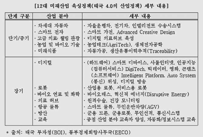 다만 경제 규모를 키웠음에도 고성장세를 이어가지 못하는 '중진국 함정' 위험성이 거론됨에 따라 태국 정부는 현재 첨단기술산업 부흥과 미래 산업 육성을 위한 중장기 국가발전계획을 적극 추진하고 있다.