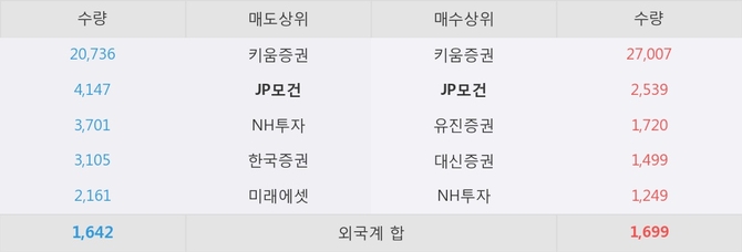 거래원 동향은 JP모건, NH투자가 매수 상위 목록에 나타나고 있다. 한편, 매도 창구 상위에는 JP모건이 눈에 띄고 있다.