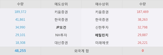 거래원 동향은 메릴린치, 미래에셋이 매수 상위 목록에 나타나고 있다. 한편, 매도 창구 상위에는 JP모건이 눈에 띄고 있다.