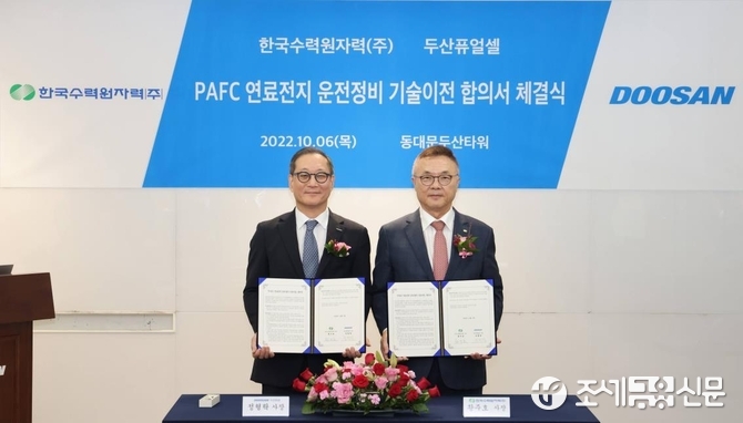 한수원은 6일 서울 중구 두산타워빌딩에서 두산퓨얼셀과 인산형 연료전지(PAFC) O&M 기술 이전 합의서를 체결했다면서 이같이 밝혔다.