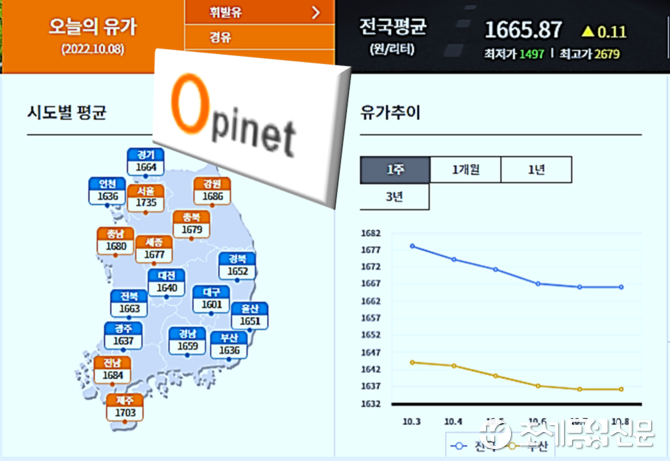 8일 한국석유공사 유가정보시스템 오피넷에 따르면 10월 첫째 주(10.2∼7) 전국 주유소 휘발유 평균 판매가격은 전주보다 30.9원 내린 L(리터)당 1천674.0원으로 집계됐다.