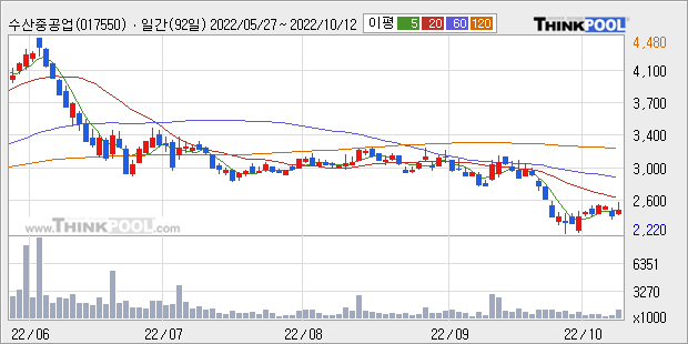 수산중공업의 2021년 매출액은 전년대비 83.6% 늘어난 2530억원이고, 영업이익 또한 전년대비 103.9% 늘어난 143억원을 기록했다. 이 회사의 매출액 증감률과 영업이익 증감률은 각각 코스피 상위 3%, 상위 26%에 해당된다.