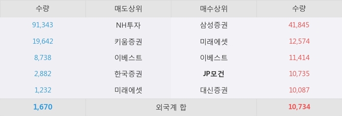 거래원 동향은 NH투자, 미래에셋 등이 매도 상위 목록에 나타나고 있다. 한편, 매수 창구 상위에는 JP모건이 눈에 띄고 있다.
