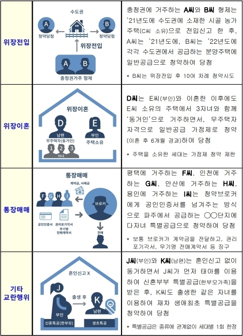 특히 혼인신고 없이 동거하며 태아를 이용해 임신한 여성이 신혼부부 특별공급을 받은 뒤, 자녀가 출생하면 아버지가 생애최초 특별공급을 받는 경우도 2건 있었다.