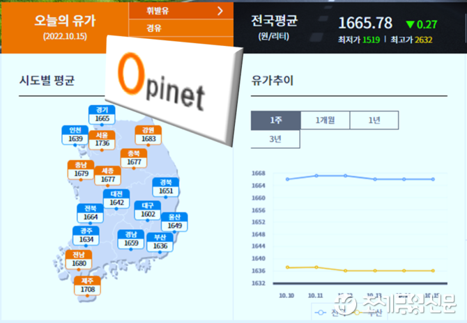 15일 한국석유공사 유가정보시스템 오피넷에 따르면 10월 둘째 주(10.9∼13) 전국 주유소 휘발유 평균 판매가격은 전주보다 7.4원 내린 L(리터)당 1천666.5원으로 집계됐다. 휘발유 가격은 주간 단위로 5주 연속 하락세를 이어갔다.