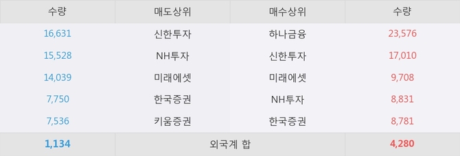 거래원 동향은 하나금융, 미래에셋, NH투자 등이 매수 상위 목록에 나타나고 있다.