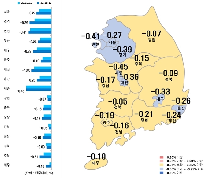 한국부동산원은 “급매물 위주의 하락거래 발생과 매물가격 하향조정이 지속되는 가운데, 추가 금리인상 여파로 부동산 경기 하락이 심화될 것이라는 시장의 우려가 매수 관망세로 이어지며 하락폭이 확대되고 있는 분위기다”고 설명했다.