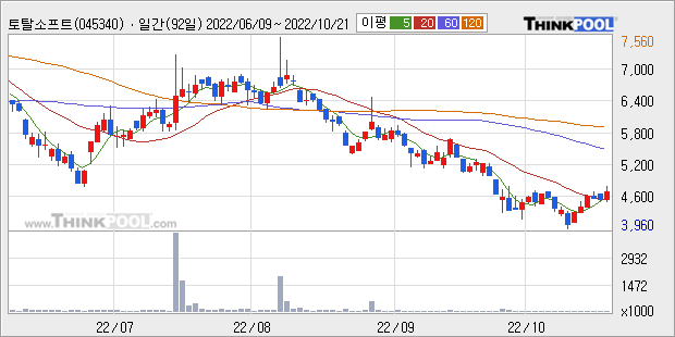 토탈소프트는 2021년 매출액 141억원과 영업이익 30억원을 기록했다. 전년대비 매출은 16.1%, 영업이익은 19.2% 각각 상승했다. 이 회사의 매출액 증감률과 영업이익 증감률은 각각 코스닥 상위 45%, 하위 49%에 해당된다.
