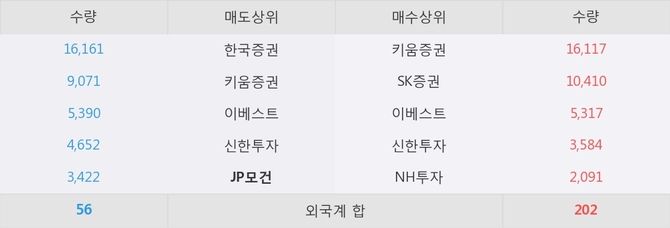 이 시각 주요 거래원은 NH투자, 키움증권, SK증권 등이 매수 상위 창구에 자리하고 있다. 한편, 매도 창구 상위에는 JP모건이 눈에 띄고 있다.
