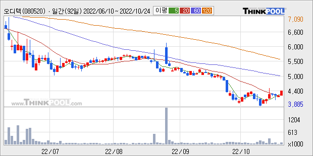 오디텍의 2021년 매출액은 전년대비 28.9% 늘어난 544억원이고, 영업이익 또한 전년대비 265.6% 늘어난 48억원을 기록했다. 이 회사의 매출액 증감률과 영업이익 증감률은 각각 코스닥 상위 28%, 상위 10%에 해당된다.