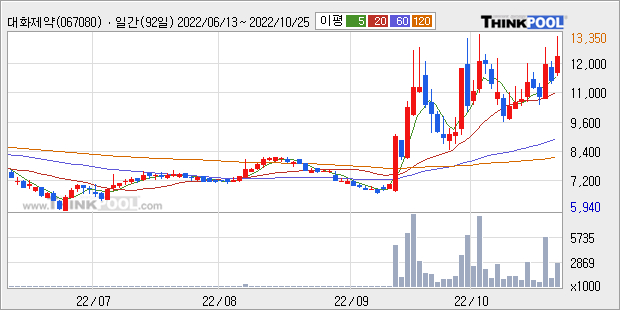 대화제약의 2021년 매출액은 1172억으로 전년대비 7.1% 상승했고, 영업이익은 33억으로 전년대비 -16.8% 하락했다. 이 회사의 매출액 증감률과 영업이익 증감률은 각각 코스닥 하위 38%, 하위 34%에 해당된다.