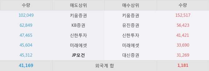 이 시각 주요 거래원은 미래에셋, 키움증권, 유진증권 등이 매수 상위 창구에 자리하고 있다. 한편, 매도 창구 상위에는 JP모건이 눈에 띄고 있다.