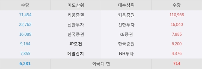 이 시각 주요 거래원은 NH투자, 키움증권, 신한투자 등이 매수 상위 창구에 자리하고 있다. 한편, 매도 창구 상위에는 JP모건과 메릴린치가 눈에 띄고 있다.