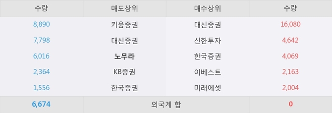 이 시각 주요 거래원은 미래에셋, 대신증권, 신한투자 등이 매수 상위 창구에 자리하고 있다. 한편, 매도 창구 상위에는 노무라가 눈에 띄고 있다.