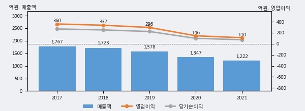최근 3년간의 실적을 살펴보면, 매출액은 3년 연속 하락하고 있으나 그 하락폭은 줄어들고 있음을 알 수 있다.
