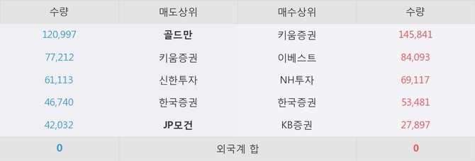 이 시각 주요 거래원은 NH투자, 키움증권, 이베스트 등이 매수 상위 창구에 자리하고 있다. 한편, 매도 창구 상위에는 골드만과 JP모건이 눈에 띄고 있다.