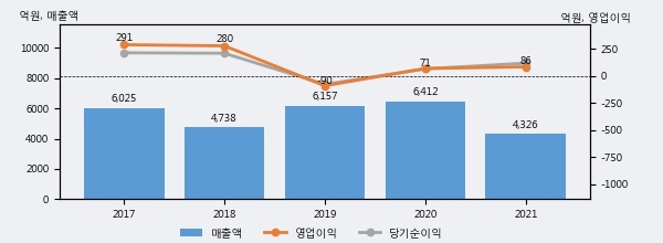 세보엠이씨의 2021년 매출액은 전년대비 -32.5% 줄어든 4326억원이고, 영업이익은 전년대비 21.5% 늘어난 86억원을 기록했다. 이 회사의 매출액 증감률과 영업이익 증감률은 각각 코스닥 하위 7%, 상위 49%에 해당된다.
