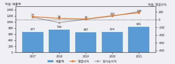 최근 실적을 살펴보면 2021년 매출액이 최근 5년 중 가장 높은 실적을 기록했음을 알 수 있다. 이전 최고 실적이었던 2018년 보다도 12.7%(94억 4천만원) 늘어난 것으로 나타났다.