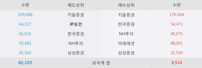 거래원 동향은 NH투자, 미래에셋, 삼성증권 등이 매수 상위 목록에 나타나고 있다. 한편, 매도 창구 상위에는 JP모건이 눈에 띄고 있다.