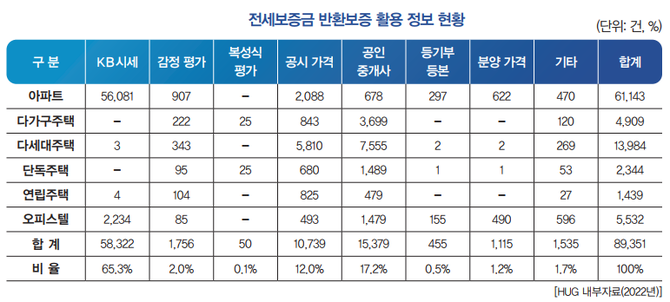 2018년 주택도시보증공사(HUG) 내부자료에 따르면 전세보증금 반환보증 활용정보현황에서 가장 많은 건수를 가입한 아파트의 경우 총 6만 1143건 보증가입 중 KB부동산시세를 활용한 경우가 5만 6081건, 감정평가서 활용이 907건, 공시가격 활용이 2088건, 공인중개사의 시세정보활용이 678건, 등기부등본 거래가격 활용이 297건, 분양가격활용이 622건 기타 470건으로 나타났다. 2018년 기준 주택 유형별 가입현황을 가격산정 유형별로 구분해 보면 KB시세가 65%, 공인중개사 시세확인서 17%, 공시가격 12%, 감정평가는 2%에 불과했다.