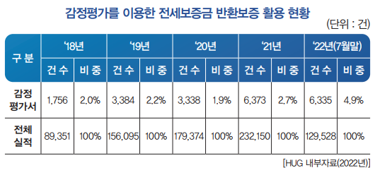 감정평가사의 감정평가가격은 현재가치를 중심으로 평가하도록 되어 있으나 수수료 문제로 이를 활용하지 못하는 것이다. 그래서 감정평가를 활용한 비율은 2018년 2%에서 2022년 7월 4.9%로 높아졌으나, 전체 보증보험 가입 건수와 비교하면 극히 미미한 상태이다.