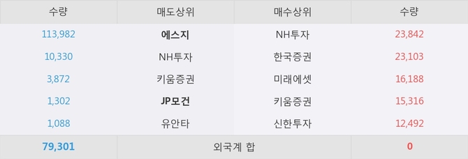 거래원 동향은 에스지, JP모건, NH투자 등이 매도 상위 목록에 위치하고 있다.