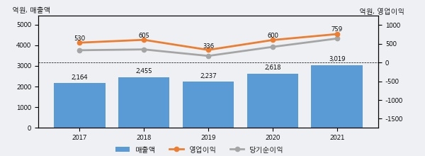 최근 실적을 살펴보면 2021년 매출액이 최근 5년 중 가장 높은 실적을 기록했음을 알 수 있다. 이전 최고 실적이었던 2020년 보다도 15.3%(400억 8천만원) 늘어난 것으로 나타났다.