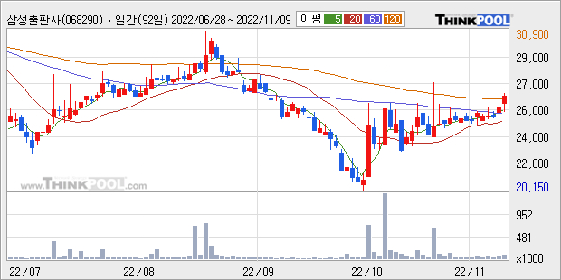 삼성출판사는 2021년 매출액 1875억원과 영업이익 80억원을 기록했다. 전년대비 매출은 12.2% 상승했고, 영업이익은 흑자전환했다. 이 회사의 매출액 증감률과 영업이익 증감률은 각각 코스피 하위 47%, 상위 13%에 해당된다.