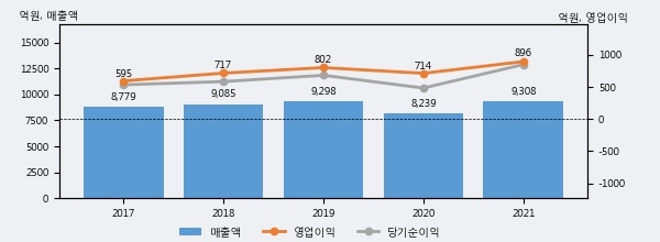 최근 실적을 살펴보면 2021년 매출액이 최근 5년 중 가장 높은 실적을 기록했음을 알 수 있다. 이전 최고 실적이었던 2019년 보다도 0.1%(9억 8천만원) 늘어난 것으로 나타났다.
