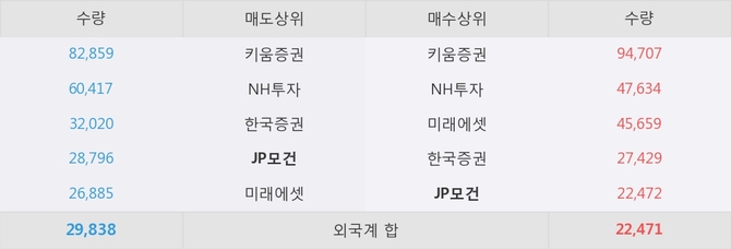 거래원 동향은 JP모건, NH투자, 미래에셋 등이 매수 상위 목록에 나타나고 있다. 한편, 매도 창구 상위에는 JP모건이 눈에 띄고 있다.