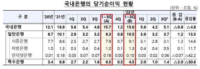 17일 금융감독원은 이같은 내용이 담긴 ‘2022년 3분기 국내 은행 영업실적(잠정)’ 자료를 발표했다.