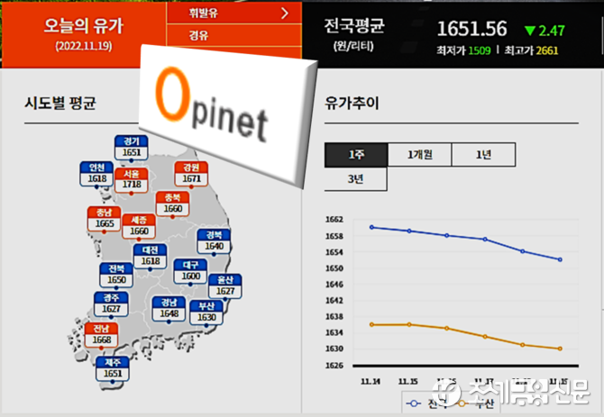 19일 한국석유공사 유가정보시스템 오피넷에 따르면 11월 셋째 주(11.13∼17) 전국 주유소 휘발유 평균 판매가격은 지난주보다 0.9원 내린 1천658.7원으로 집계, 주간 단위로 10주 연속 하락했다.