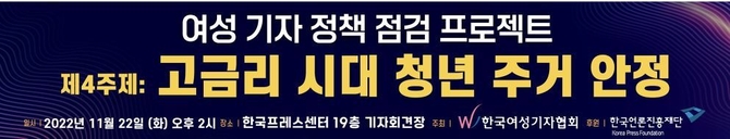 한국여성기자협회는 '고금리 시대 청년 주거 안정'을 주제로 오는 22일 오후 2시 한국프레스센터 19층 기자회견장에서 토론회를 연다고 20일 밝혔다.