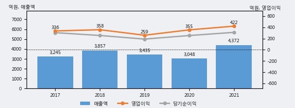 최근 실적을 살펴보면 2021년 매출액이 최근 5년 중 가장 높은 실적을 기록했음을 알 수 있다. 이전 최고 실적이었던 2018년 보다도 13.3%(514억 3천만원) 늘어난 것으로 나타났다.