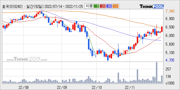 추세선으로 보면 현재 단기·중기 이평선이 정배열 상태로 전형적인 상승세를 보이고 있다. 최근 이 종목의 차트에서 최근 5일 매물대 돌파, 최근 60일 매물대 돌파 등의 특이사항이 발생했다.
