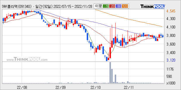 일봉 차트의 모습은 단기 이평선이 역배열을 만들며 조정을 받다가 다시 상승으로 돌아선 모습이다. 최근 이 종목의 차트에서 골든크로스, 삼선전환도(양전환) 등의 특이사항이 발생했다.