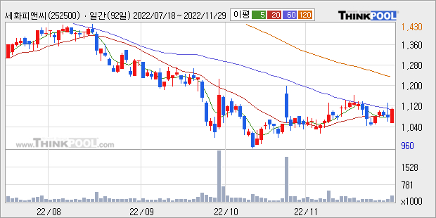 세화피앤씨의 2021년 매출액은 전년대비 8.4% 늘어난 397억원이고, 영업이익 또한 전년대비 4.2% 늘어난 54억원을 기록했다. 이 회사의 매출액 증감률과 영업이익 증감률은 각각 코스닥 하위 40%, 하위 42%에 해당된다.