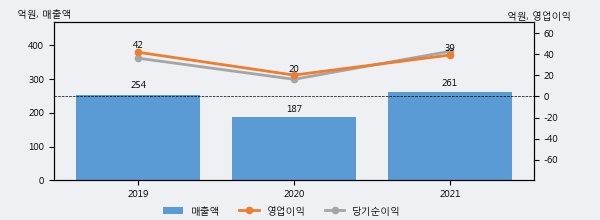 최근 실적을 살펴보면 2021년 매출액이 최근 3년 중 가장 높은 실적을 기록했음을 알 수 있다. 이전 최고 실적이었던 2019년 보다도 2.8%(7억원) 늘어난 것으로 나타났다.