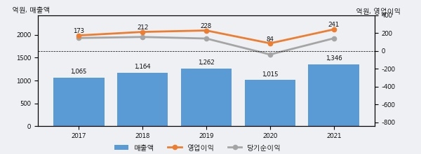최근 실적을 살펴보면 2021년 매출액이 최근 5년 중 가장 높은 실적을 기록했음을 알 수 있다. 이전 최고 실적이었던 2019년 보다도 6.7%(84억원) 늘어난 것으로 나타났다.