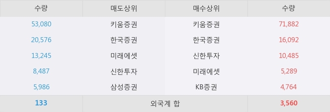 이 시각 주요 거래원은 미래에셋, 키움증권, 한국증권 등이 매수 상위 창구에 자리하고 있다.