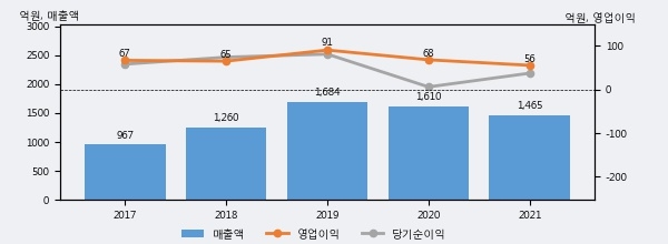 지엔씨에너지의 2021년 매출액은 1465억으로 전년대비 -9.0% 하락했고, 영업이익 역시 56억으로 전년대비 -18.6% 하락했다. 이 회사의 매출액 증감률과 영업이익 증감률은 각각 코스닥 하위 17%, 하위 33%에 해당된다.