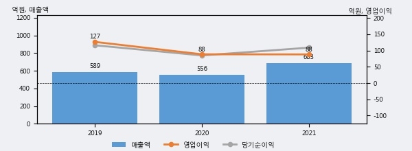 최근 실적을 살펴보면 2021년 매출액이 최근 3년 중 가장 높은 실적을 기록했음을 알 수 있다. 이전 최고 실적이었던 2019년 보다도 16.1%(94억 5천만원) 늘어난 것으로 나타났다.