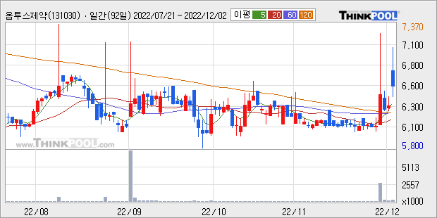 차트상 주가의 흐름은 단기간에 골든크로스를 만들고 주가가 60일선까지 뚫고 가는 모습이다. 이 종목의 차트에서 최근에 최근 5일 매물대 돌파, 최근 60일 매물대 돌파, 삼선전환도(양전환) 등을 확인할 수 있다
