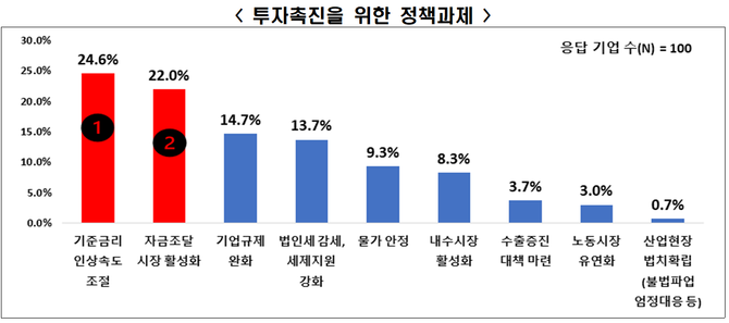 기업들은 국내 투자 활성화를 위해 기준금리 인상 속도 조절(24.6%), 자금조달 시장 활성화(22.0%), 기업 규제 완화(14.7%), 법인세 감세 및 세제지원 강화(13.7%) 등을 요구했다.