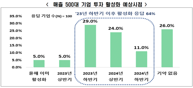투자 흐름이 좋아질 시점에 대해서는 2023년 하반기 29.0%, 2024년 상반기 24.0%, 2024년 하반기 11.0%로 전망했다. ‘기약 없음’은 26.0%였다.