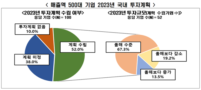 전국경제인연합회(전경련)이 모노리서치에 의뢰해 지난달 17~25일 매출 500대 기업을 대상으로 2023년 국내 투자계획을 물은 결과 응답 기업 100개 가운데 52.0%가 내년 투자계획이 있다고 답했다.