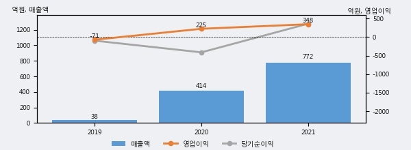 최근 실적을 살펴보면 2021년 매출액이 최근 3년 중 가장 높은 실적을 기록했음을 알 수 있다. 이전 최고 실적이었던 2020년 보다도 86.7%(358억 5천만원) 늘어난 것으로 나타났다.