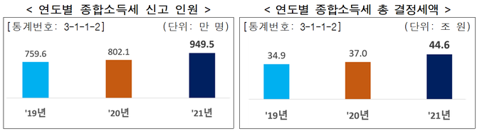 국세청이 7일 공개한 2022년 4분기 국세통계에 따르면, 지난해 종합소득세 신고 인원은 949.5만명으로 전년대비 18.4%(147.4만명) 늘었다.