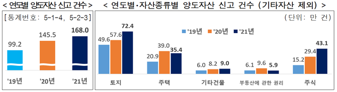 지난해 자산별 양도 건수는 토지(72.4만건)가 가장 많았고, 주식(43.1만건), 주택(35.4만건) 순이었다. 건수 증가율은 주식(46.6%), 토지(25.7%), 기타건물(9.8%) 순이었다.