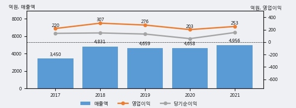최근 실적을 살펴보면 2021년 매출액이 최근 5년 중 가장 높은 실적을 기록했음을 알 수 있다. 이전 최고 실적이었던 2018년 보다도 2.6%(125억원) 늘어난 것으로 나타났다.